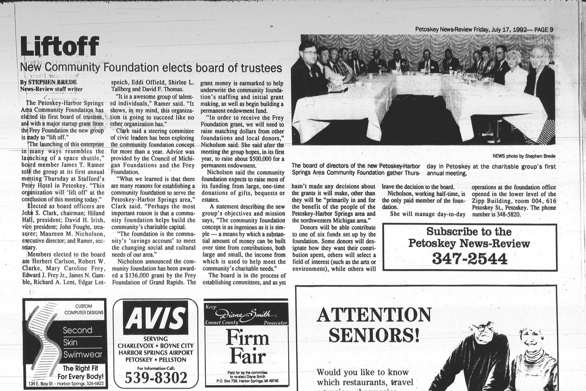 On July 16, 1992, the Petoskey-Harbor Springs Area Community Foundation held its first annual meeting to elect the founding board of directors, to announce the organization’s first executive director, and to formally launch of the organization. In a Petoskey News-Review article appearing the following day under the heading “Liftoff,” Jim Ramer, one of the founding board members, likened the event to the launching of a space shuttle. Ramer said, “This organization will ‘lift off’ at the conclusion of this meeting today.”